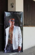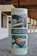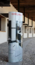 Totem bifacciale con base ellittica realizzato in cartone teso.
